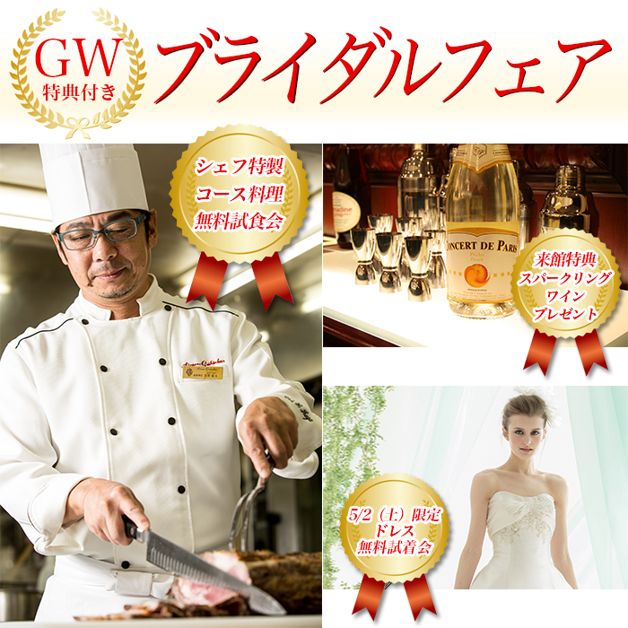 5/2(土)〜5/6(水)の連休ブライダルフェアでは、スペシャル特典&プレゼントをご用意しております。