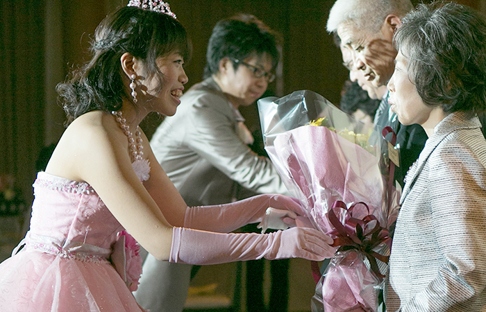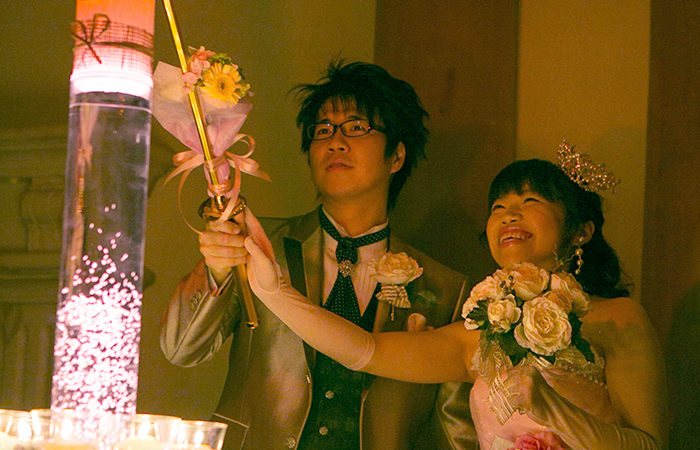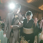 まずパーティ会場のテーブルコーディネートやお花の色使いを褒めてもらえました。そんな温かな雰囲気の中で、ゲスト皆さんにご参加いただいてキャンドルリレーを行いました。各テーブルから炎を集めて、最後はメインキャンドルに点火!祝福の気持ちが形になって表れたようでした。その他祖父母にサプライズプレゼントを用意するなど、結婚式に来てくれた皆とのふれ合いの時間を大切に過ごしました。