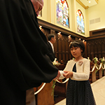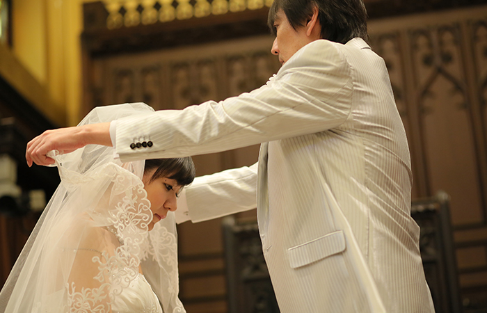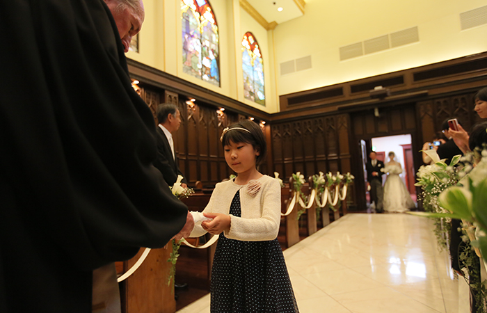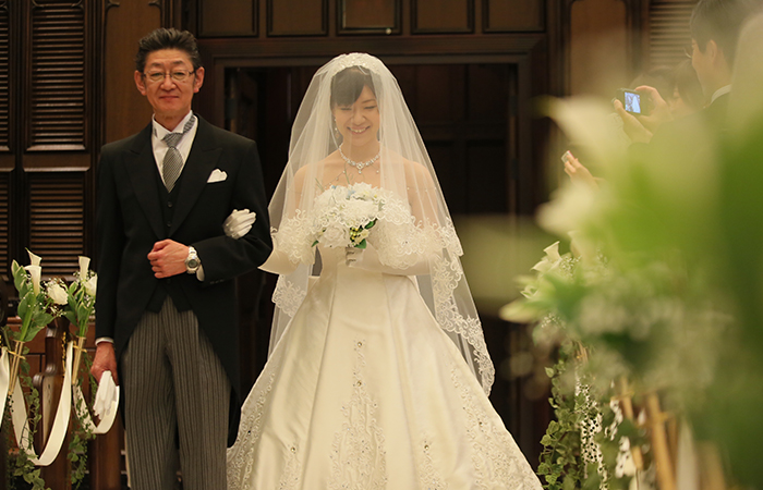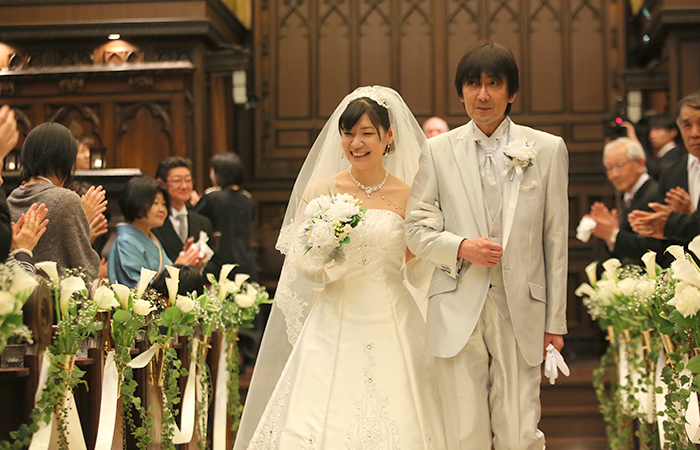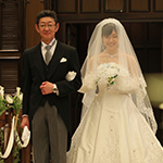 リハーサルからとても緊張しましたが、神父さんがとても面白い方で新郎新婦、父の緊張をほぐしてくださいました。リラックスしすぎて本番では足の出し方やエスコートなどがグダグダになってしまいましたが(汗)、挙式の最後に神父さんから「うまく出来てましたよ」と言っていただき、笑顔で退場できました。友達が撮ってくれた写真を見ると、チャペルの雰囲気に白いウェディングドレスが映えて、とてもキレイでした。
