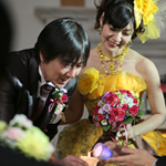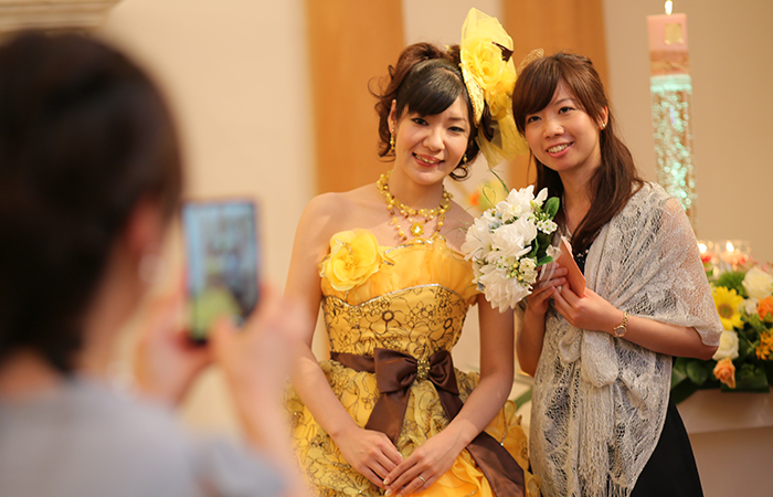 お花などはビタミンカラーの黄色やオレンジでコーディネートしてもらいました。カラードレスも黄色で、うまくマッチしていたように思います。ひまわりが入っているのが嬉しかったです!ゲスト待合室や受付に手作りグッズを置いたのですが、両親もゲストの皆さんも手作りということに驚いていたので、時間がない中でも頑張って作って良かったと思いました。