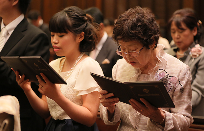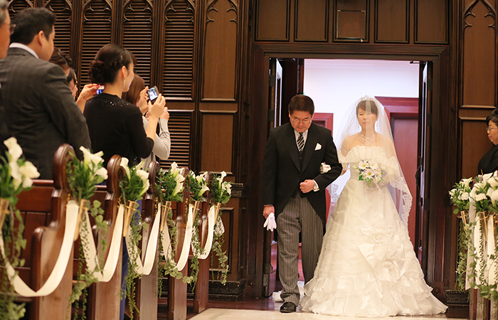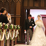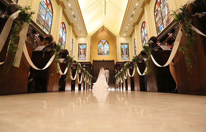 聖歌隊とパイプオルガン・ハープの生演奏が、ステンドグラスに囲まれたアンティークの教会の雰囲気をより引き立てていて、神聖な雰囲気の中素敵な結婚式ができました。新婦の入場前に新婦の今までの人生を振り返った生い立ちのムービーを流したのですが、私たち自身はもちろん、ゲストの皆様にも感動していただけたようで、挙式での映像演出はやってよかったと思いました。
