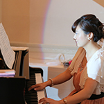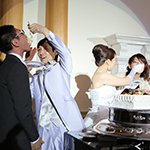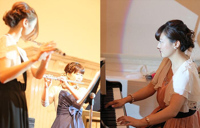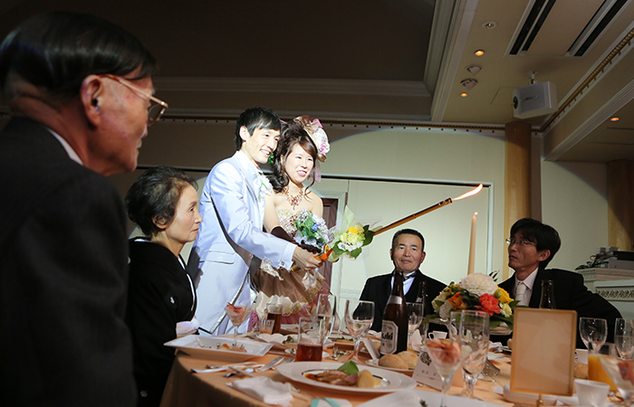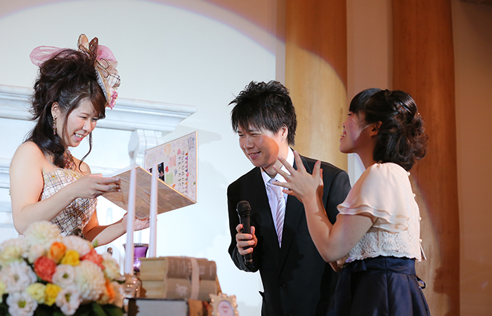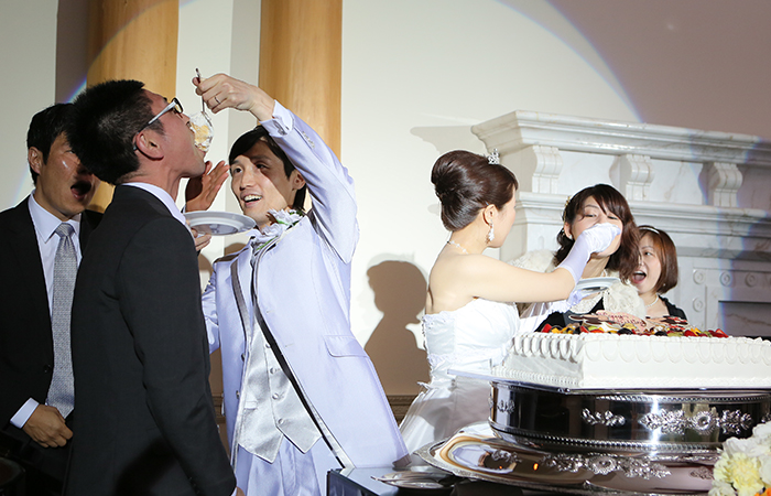 ケーキのセレモニーでは。お互いのファーストバイトのあとサプライズで友人にも参加してケーキを食べていただきましたが、とても盛り上がり面白かったです。お色直しの再入場のときにはキャンドルサービスをしながら、各テーブルで写真撮影をしました。参加していただいた全員と写真をとることができたので良い記念になりましたし、会話もしながら、各テーブルをまわれたのでとても楽しかったです。また、余興では友人からピアノとフルートの演奏をしていいただき、パーティに華を添えてもらいました。