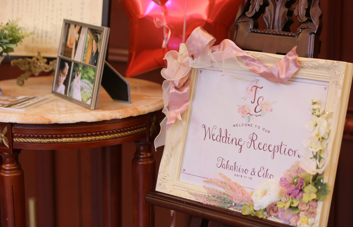 大人かわいい感じにしたかったので、ピンクをメインに全体的に淡く優しい感じにしてもらいました。あまり手作りのものを作ったりはできませんでしたが、サプライズで飾っていただいた物や、プレゼントとしていただいたものもあり、かわいらしく、素敵な飾り付けになり、本当に感謝です。