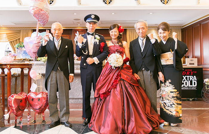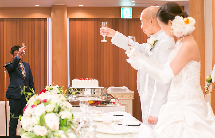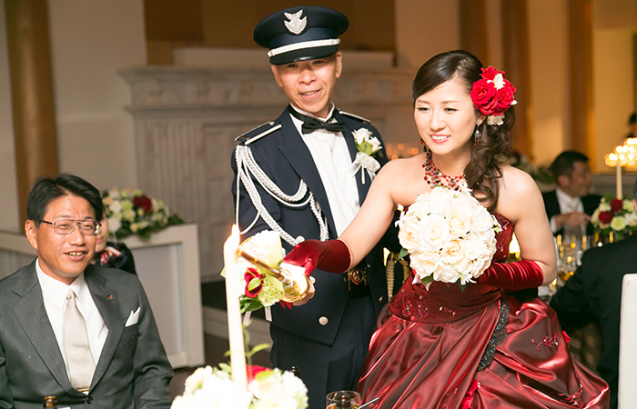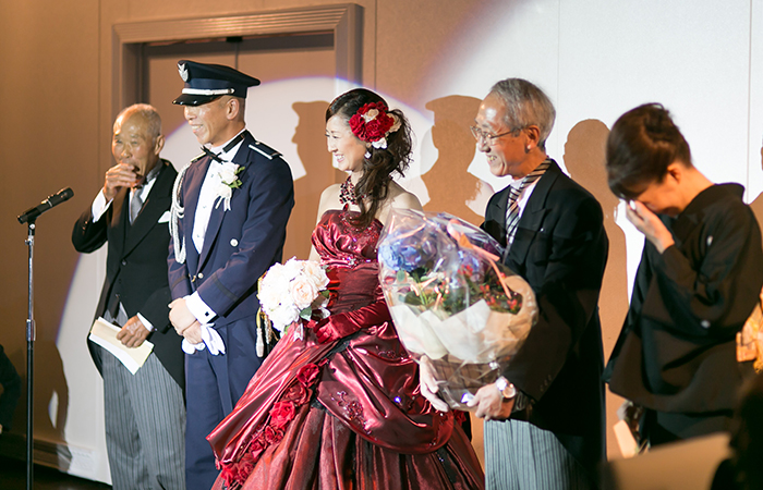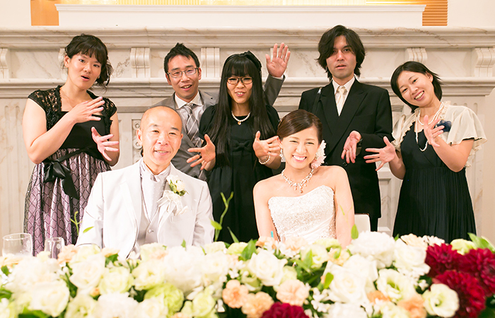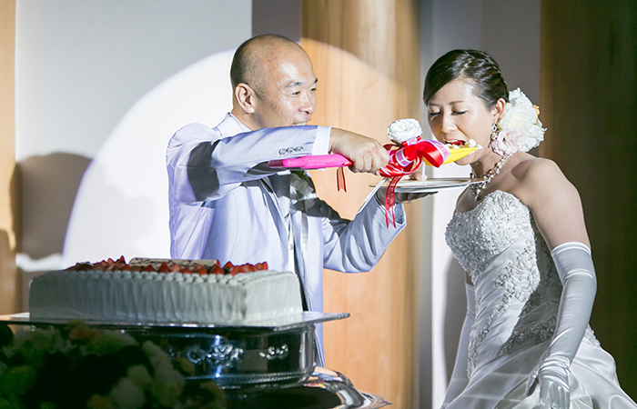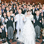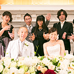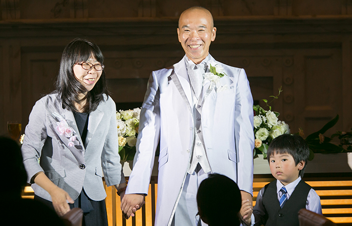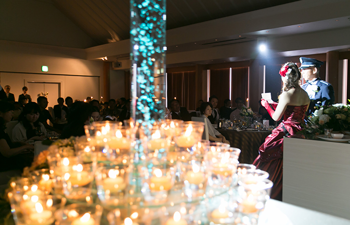 なるべく多くの方に楽しんでもらえる面白いパーティにしたかったので、そのあたりを意識しました。たとえばファーストバイトで食べさせあう回数を3回にし、新婦の食べる番でオチが付くようにしたり、お色直し中座ではサプライズ同伴者に新郎新婦の兄弟とその子供たちを指名し、久々にみんなで手をつないだ姿を両親に見せることができました。また使用するBGMもお互いこだわって相談して決めました。歌詞やタイアップした番組が式の内容とリンクしているものを選ぶようにし、ゲストに耳から楽しんでもらえるよう、朝ドラ主題歌や映画音楽、最近の邦楽から昔の洋楽など、幅広いジャンルから集めました。