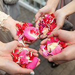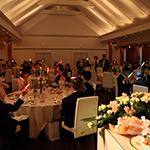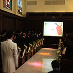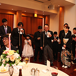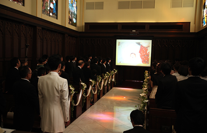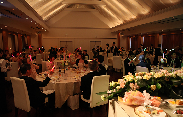 キャンドルサービスの最後に点火する台の周りに小さいキャンドルを置いて、ゲスト皆にそこに一つずつ点火してもらいました。会場にいる全員で灯を点したテーブルに、なんだか感動してしまいました。
