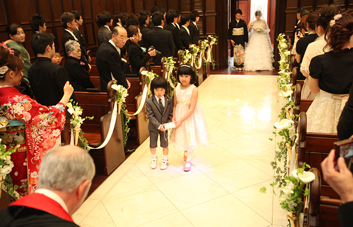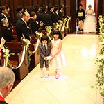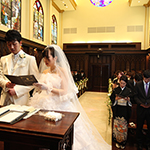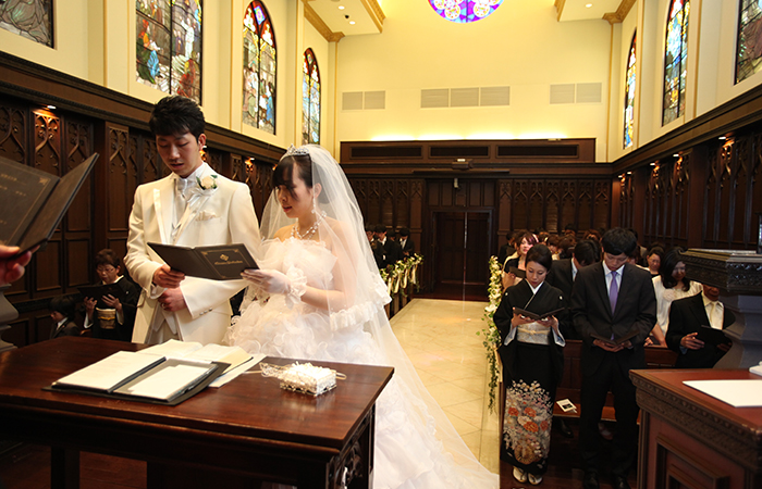 このチャペルが気に入って会場を決めました。ステンドグラスがきれいだし、木製のシックな内装も気に入っています。結婚式の日はいいお天気で、ステンドグラスから入っている光からも祝福されている気がしました。
