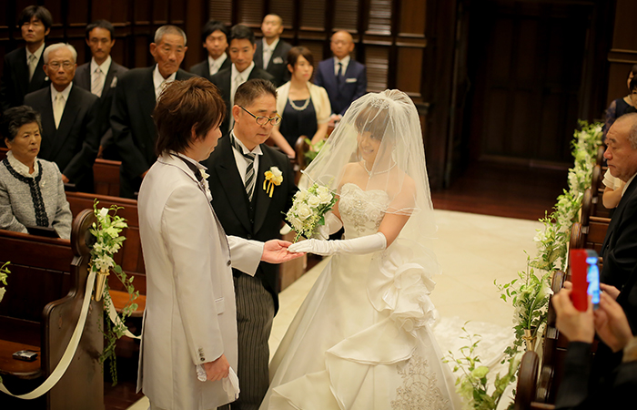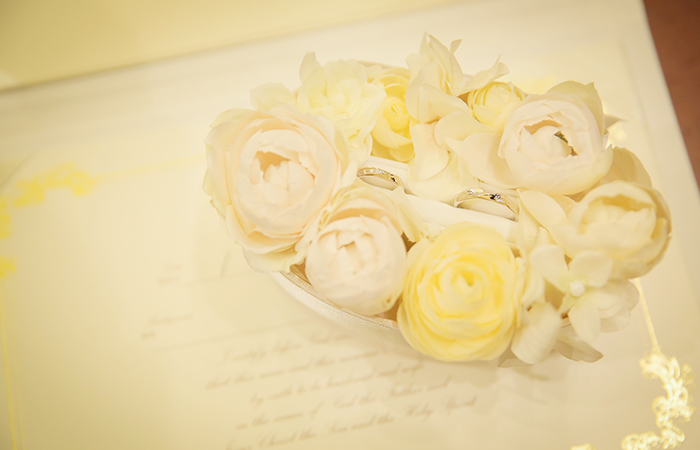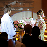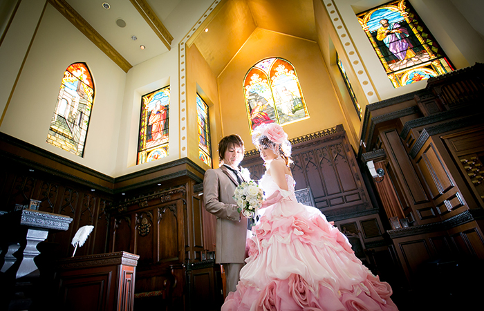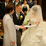 ブライダルフェアでチャペルムービーを体験し「この演出はステキ!」と思いました。ステンドグラスもとてもキレイで、この2つが会場を決める大きなポイントになりました。当日はハープの生演奏の音色が美しく、挙式を感動的に彩ってくれました。