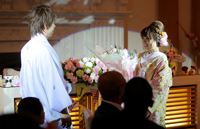 新郎が内緒で空手の余興を用意していて、板が見事に割れて盛り上がりました!その後、新婦への花束と手紙を読み上げてくれるサプライズも用意されていて嬉しかったです。また近々結婚する予定の友人と、当日誕生日だった友人それぞれにもサプライズプレゼントを用意しました。突然のことでしたが、とても喜んでくれました。