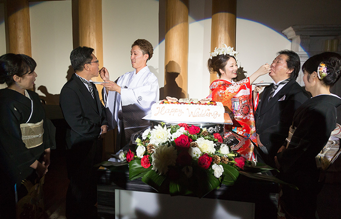 ケーキカットの時は両親にも参加してもらい、サンクスバイトをしました。突然だったので驚いていたみたいだけど、父も母も笑顔でケーキを食べてくれました。キャンドルサービス最後には、キャンドル下の水槽から泡が湧き上がる「バブルピラシャン」に点火し、その演出がとても華やかで綺麗でした!