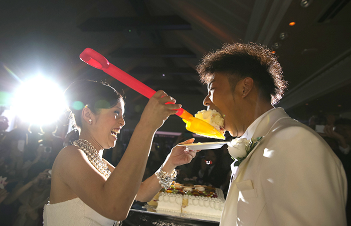 品数が多くビジュアルもキレイで、食べるのはもちろん見ていても楽しかったそうです。フルーツいっぱいのウェディングケーキの上には3枚のハートチョコプレートを。それぞれに家族の名前を書きました。色とりどりの幸せに包まれて、まさに私たちの気持ちそのものでした。
