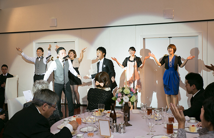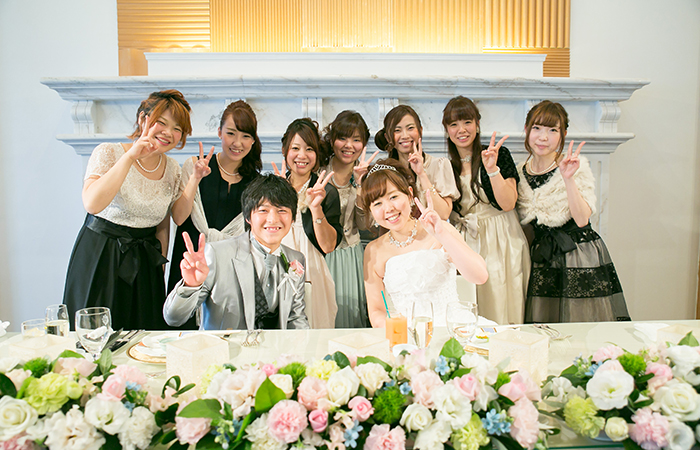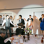 イベントをあまり詰め込まないで、ゆっくり食事やおしゃべりを楽しんでもらえるパーティにしたいと思いました。そんなゆったりした進行の中で盛り上がったのはブーケプルズ。新婦の友人達が多かったのですが、歓声があがるほど皆楽しんでくれました!