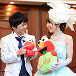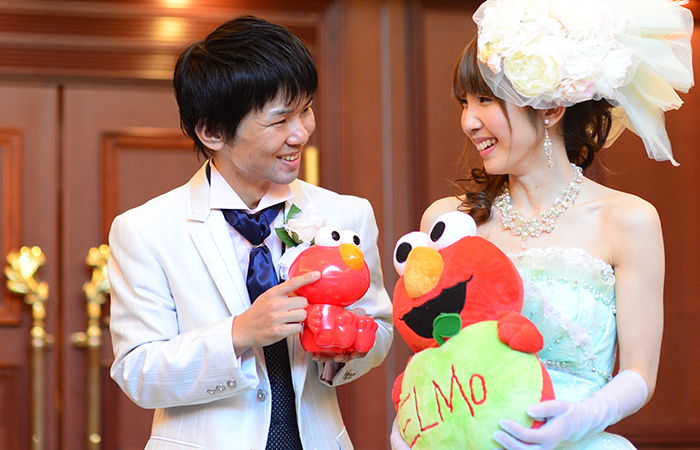 会場全体に二人が好きなエルモグッズと、手作りしたアイテムをたくさん飾りました。ウェディングケーキでもエルモを苺で可愛く表現してもらいました。ゲストと一緒に作ったウェディングツリーは素敵な宝物になりました。
